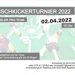 Tischkickerturnier am 2.4. um 15 Uhr im Platzhaus 10 € Startgebühr Anmeldeschluss ist der 26.3. Melde dich bei Oliver Gatz entweder telefonisch unter 0176 811 85 803 oder per Mail unter ol**********@***il.com 3 G – Regeln sind zu beachten (geimpft, genesen oder getestet)