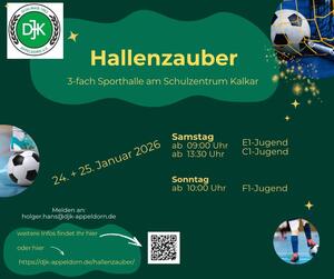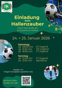 Am 24. und 25. Januar 2026 lädt die DJK Grün-Weiß Appeldorn e.V. herzlich zum traditionellen Hallenzauber in die 3-fach-Sporthalle am Schulzentrum Kalkar ein. Ein spannendes Fußballwochenende voller Technik, Teamgeist und fairer Wettkämpfe erwartet alle teilnehmenden Mannschaften, Familien und Fans.