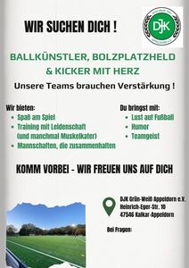 Dann bist du bei uns genau richtig! Unsere Teams von DJK Grün-Weiß Appeldorn e.V. suchen Verstärkung – egal ob Anfänger, Freizeitkicker oder ambitionierter Spieler.